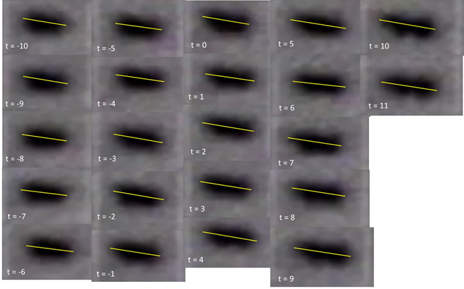 Below is a collection of snippets from the snapshots, with the time in seconds for each snippet (t = 0 is the time in the middle of the 20 s video fragment). The yellow lines are the angular sizes I calculated. There is quite some image noise, but because of the many (22) data points I could still extract some valid data (more below).