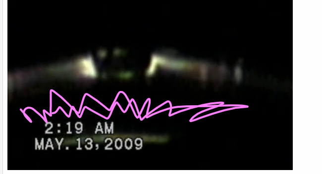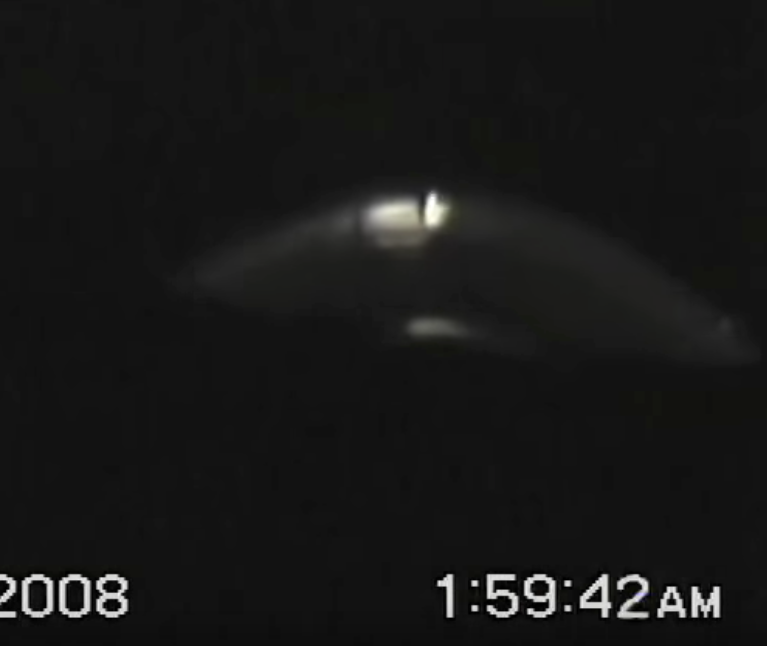 To me, the UFO image looks like a wall or fence with gateposts and a large opening which is being illuminated by something, possibly car headlights? (I've added light source in the pic below for illustrative purposes). Could this be a security camera image from a building near the beach looking out towards the sea? Or is it somewhere completely different?