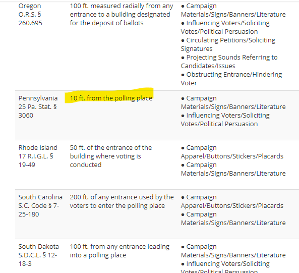 Pennsylvania's 10 feet is further than it seems and has a bit of interpretation to it. My parents live a few doors down from their polling place (a volunteer fire department) and the rule has always been enforced as the "polling place" being the entire VFD property.