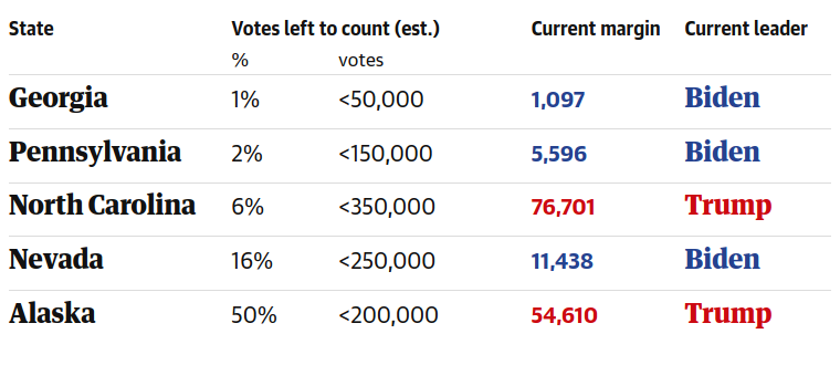 i was just watching a presser from Clark County Nevada, he says they will finish the bulk of mail in ballot counting this Saturday or Sunday and then they have to count votes up till Nov 12th that may come in. One of the southern states, maybe N. Carolina? has till the 14th!!