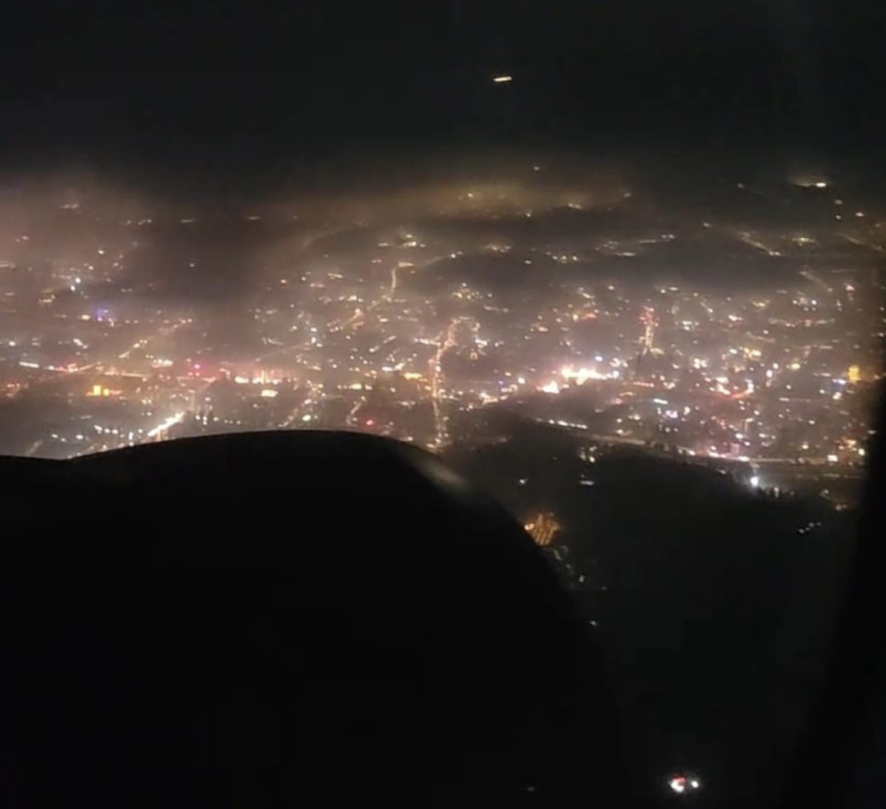 There are also bright diffraction streaks. I'm guessing that airliner windows are made of acrylic plastic. Which explains the horizontal diffraction streaks as caused by micro-features put there during the manufacturing process. If I remember right it's because of the way acrylic is polished... in one direction. A tool that moves across the surface in one direction. The smaller diffraction streaks, at all angles, can be explained by random scratching/flaws.