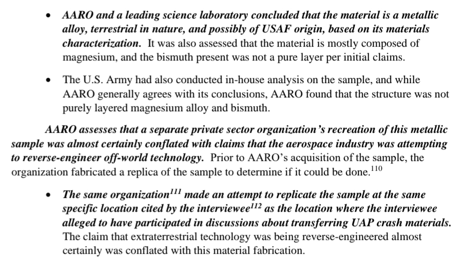 The composition of the material might be unclassified, but the methods (and personnel) used to analyse and replicate it might be classified, and that may make it difficult to declassify the whole case file; but that's what we'd want. So I hope that AARO is going to (or made to) release declassified versions of these case files.
