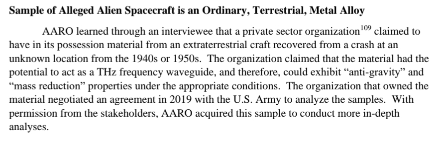 Would seeing the results of the analysis of Art's Parts confirming, more or less, what everybody already knows make that big of a difference in the scope of things? It seems that analysis is the sole "experiment" AARO carried out. I wouldn't really call it an "experiment", just an analysis of a piece of junk that UFOlogist claim can do all kinds of things. Though they've never managed to actually demonstrate those claims.