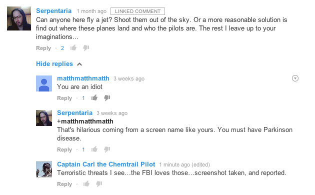 Advocating violence against "Chemtrail" planes, pilots, scientists, and debunkers