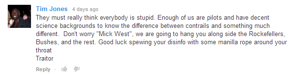 They must really think everybody is stupid. Enough of us are pilots and have decent science backgrounds to know the difference between contrails and something much different. Don't worry "Mick West", we are going to hang you along side the Rockefellers, Bushes, and the rest. Good luck spewing your disinfo with some manilla rope around your throat