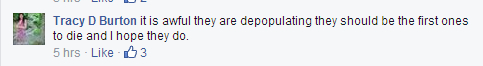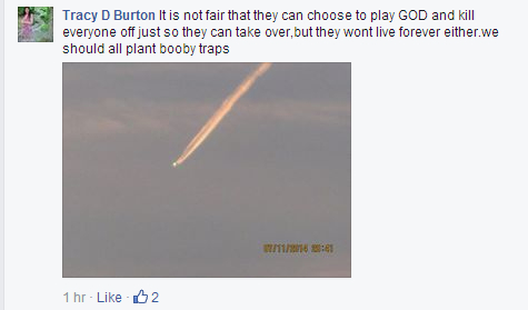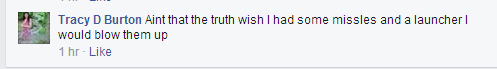 I have to be honest, I'm somewhat taken back that "Tracy D Burton" would advocate shooting down a commercial airliner with a missile, in so much so that she wishes she had a missile herself to shoot it down. This is a first for me, and I'm somewhat disgusted. How do these people get away with comments like that? I bet she isn't in the process of looking for a job with quotes like that on facebook. It's a real shame that these type of believers would actually wish or consider taking the lives of hundreds on a plane to prove a point, yet they claim to worry about the people's health on the surface.