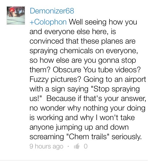 I don't want to sound conspiratorial here, but I'm thinking back to my CT days and how I would think about something like that one post by TWcobra..I would have probably thought that the person posting that on Twitter or whatever was some kind of government operative, trying to stir up trouble and get "truth seekers" busted by the FBI or something..it's just strange to me how blunt some of these chemtrail believers are, posting threats like that on social media. It's really strange to me.