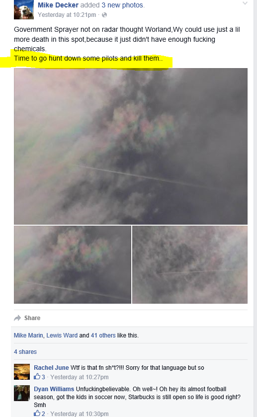 Advocating violence against "Chemtrail" planes, pilots, scientists, and debunkers