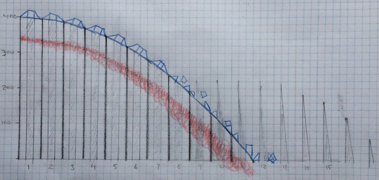 Consider a typical floor immediately below the level of collapse initiation and conservatively assume that the floor is still supported on all columns (i.e., the columns below the intact floor did not buckle or peel off due to the failure of the columns above). Consider further the truss seat connections between the primary floor trusses and the exterior wall columns or core columns. The individual connection capacities ranged from 94,000 pounds to 395,000 pounds, with a total vertical load capacity for the connections on a typical floor of 29,000,000 pounds (see Section 5.2.4 of NIST NCSTAR 1-6C). The total floor area outside the core was approximately 31,000 square feet, and the average load on a floor under service conditions on Sept. 11, 2001, was 80 pounds per square foot. Thus, the total vertical load on a floor outside the core can be estimated by multiplying the floor area (31,000 square feet) by the gravitational load (80 pounds per square foot), which yields 2,500,000 pounds (this is a conservative load estimate since it ignores the weight contribution of the heavier mechanical floors at the top of each WTC tower). By dividing the total vertical connection capacity (29,000,000 pounds) of a floor by the total vertical load applied to the connections (2,500,000 pounds), the number of floors that can be supported by an intact floor is calculated to be a total of 12 floors or 11 additional floors.