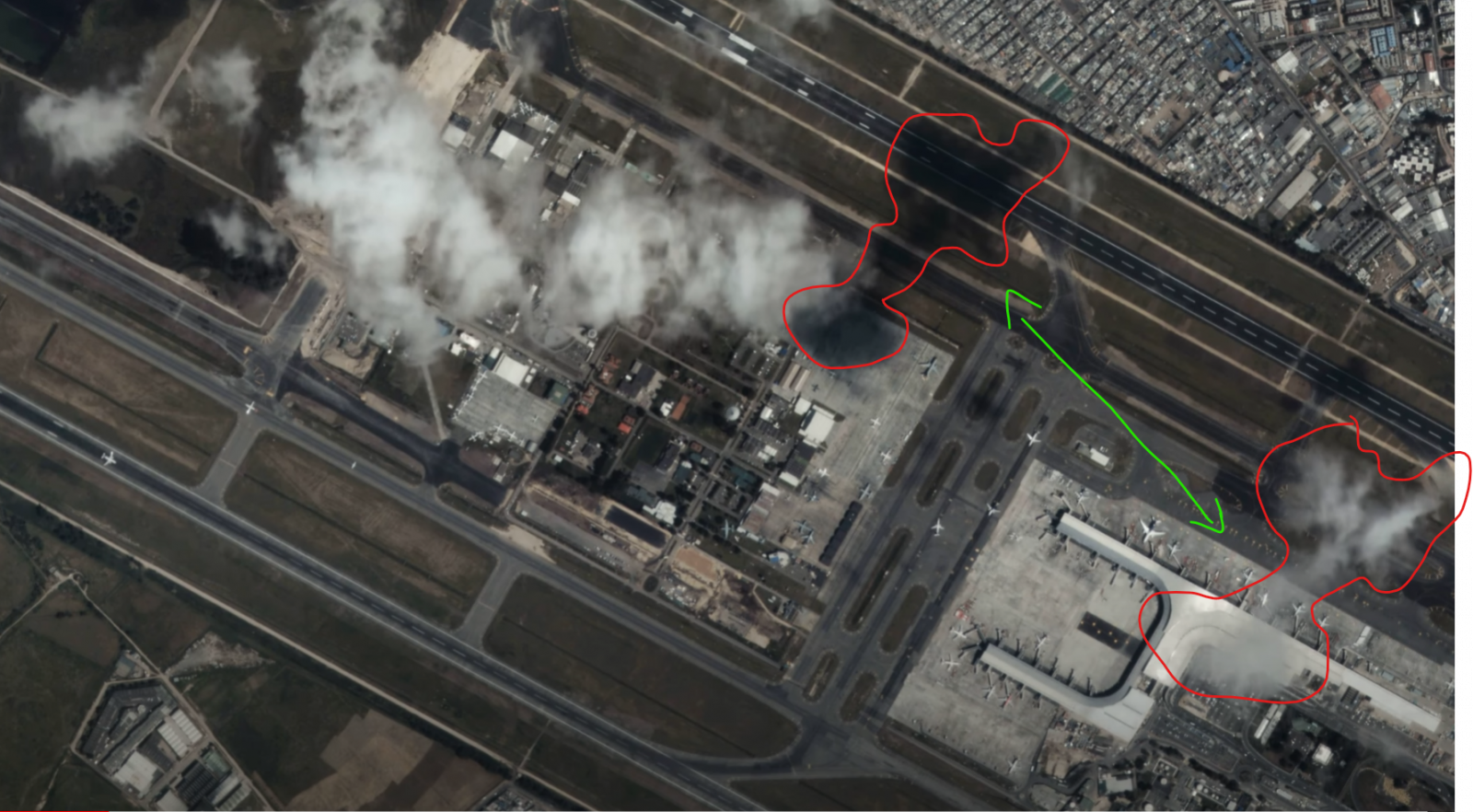 Based on relative plane length traveled and 3D matching (+ GPS coordinates for sat.) the plane has a ground speed of around 200km/h in the satellite video and a speed relative to drone of around 500km/h in the thermal video.