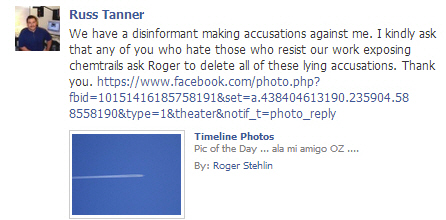 Interesting you have a shot from Tanner there. I was discussing chemtrails on a friends page. The friend called in Tanner, who told my friend to ban me (from my FRIEND'S PAGE), and remove my posts, because they were disinfo. Tanner then went back to his hypochondriac/chemtrail circle jerk page Chemtrails Global Skywatch, and told his minions to all go to my friends page: