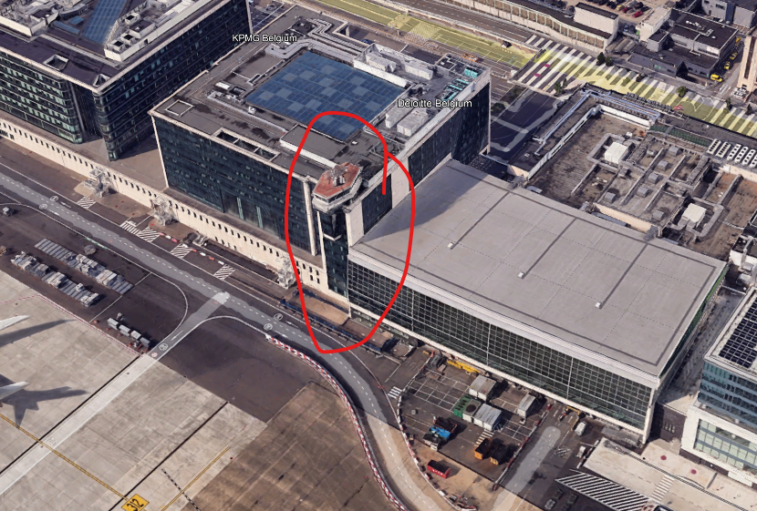 For that LOS onto the plane OO-LFC and the building on the ground, I think on top of the parking deck at 50°53'53.82"N, 4°28'56.34"E works using the angle of view onto the building in front of the airplane, and the locations of the light posts in relation to the building. Pretty much the same camera location @mvdb22 said.