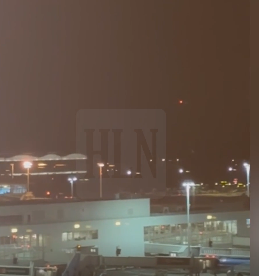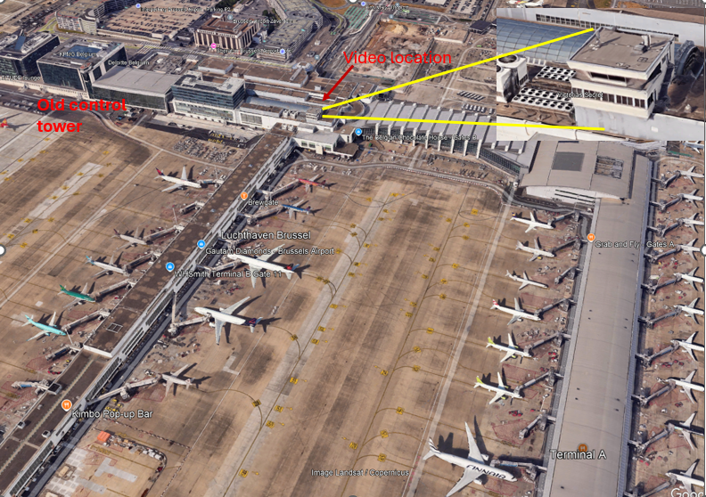 There is another video linked to by @UAV Hive, uploaded by outlet NieuwsbladOnline, which is filmed from a different location, facing a different direction, initially facing towards an area that appears to be used by cargo planes, not near the main terminals. An Air Belgium plane operated by Sichuan Logistics registered as OO-LFC is visible on the ground at the start. I do not think it is possible that this was also filmed from the old ATC tower. The line of sight onto the building and light poles does not work. It has to be somewhere with a more westward line of sight onto the building, in a position pivoted counterclockwise around OO-LFC.