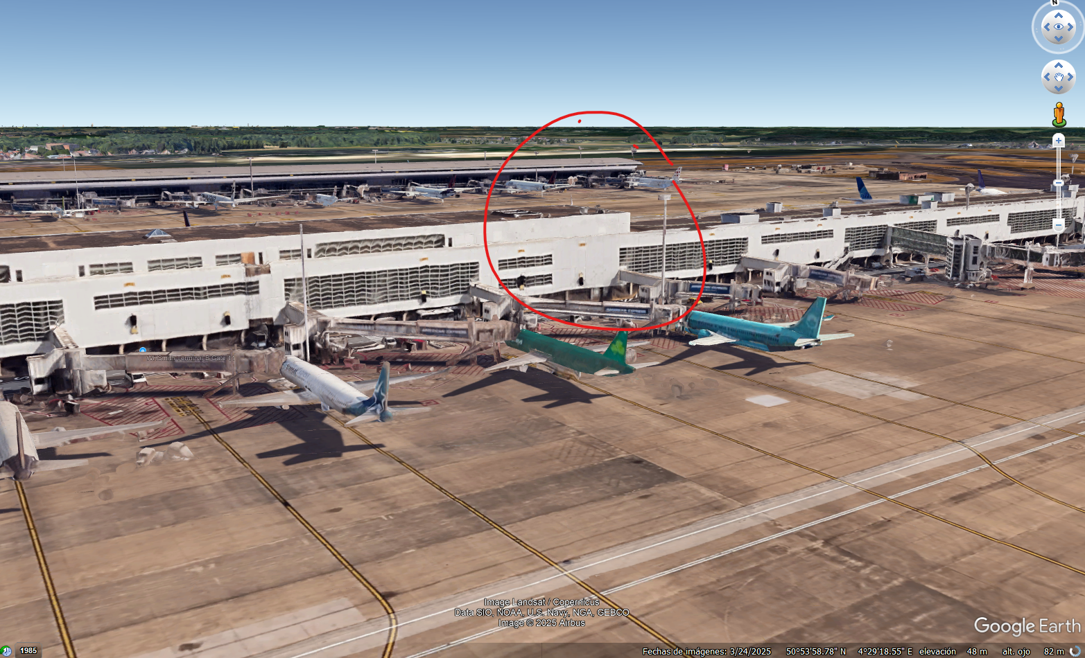 The video shows a view of the terminal B gate structure and A400 hangar that seems to be from the tower structure here