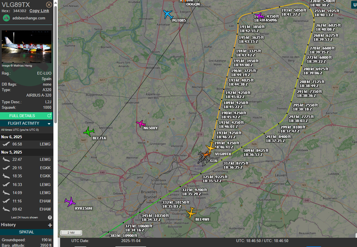 G16 initially appears on tracking at 17:11z flies towards Aarschot, vanishes from tracking at 17:17z, reappears at 18:12z at Hechtel-Eskel (40 miles/65km away) flies back towards the airport (home base) performs some loops in the flight corridor area over the N21 road then heads over the airport at 18:46z