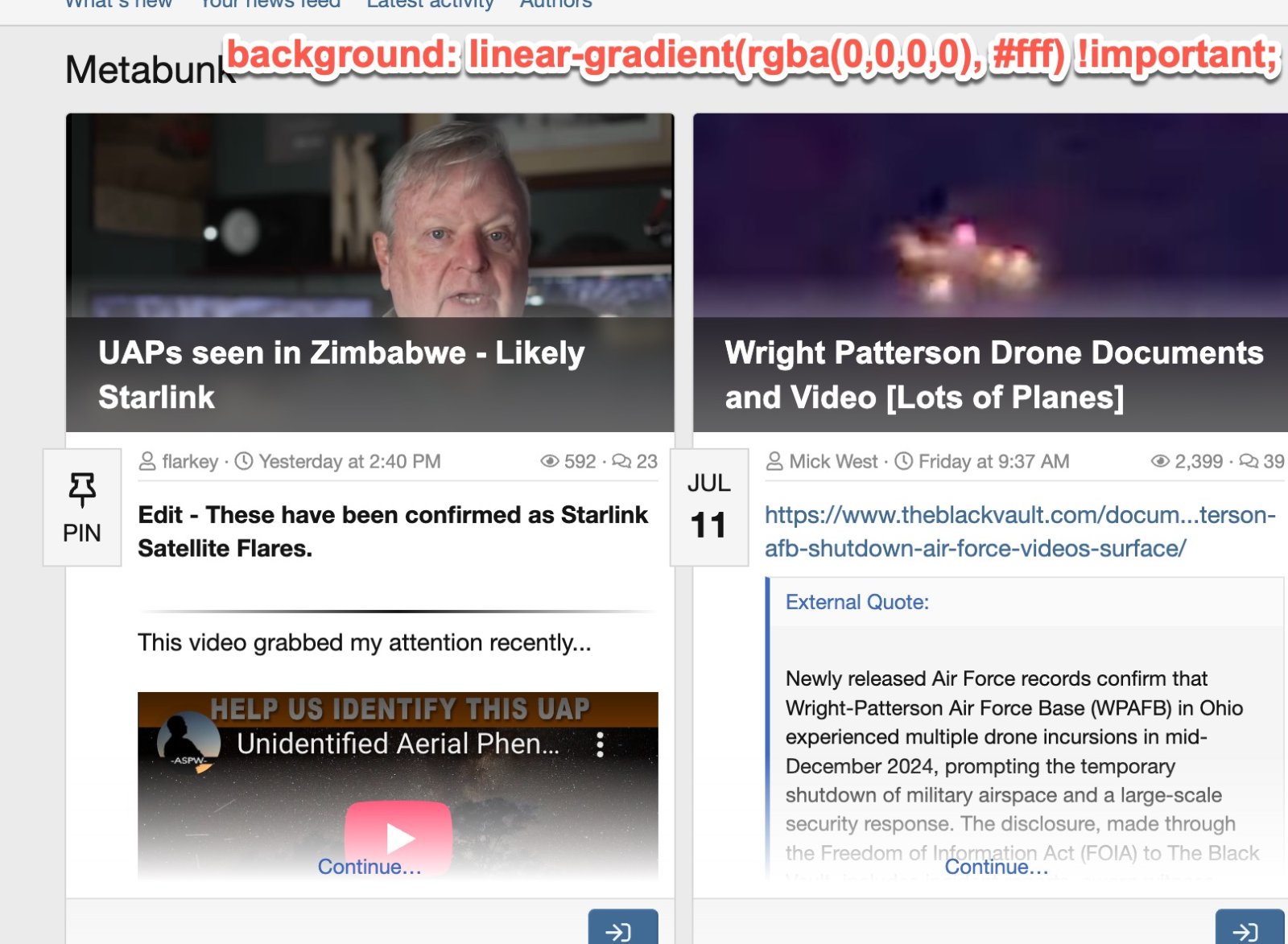 I believe XenForo is closed source, but is the code for the frontend of metabunk open source? Like the css and all that. Just curious because if it is, users with HTML/CSS/JavaScript experience might be able to more easily help out with testing some of these suggestions. I have no experience with XenForo and not a whole bunch with website frontends in general, so I'm open to the possibility my question is silly right off the bat :p