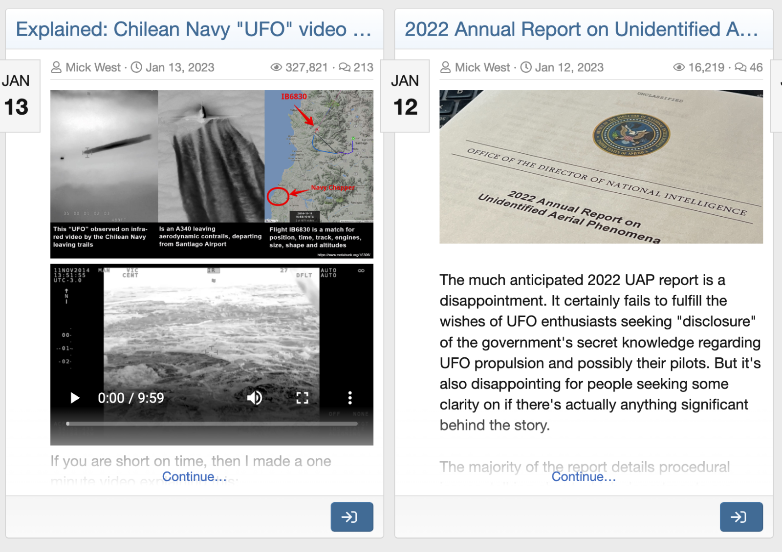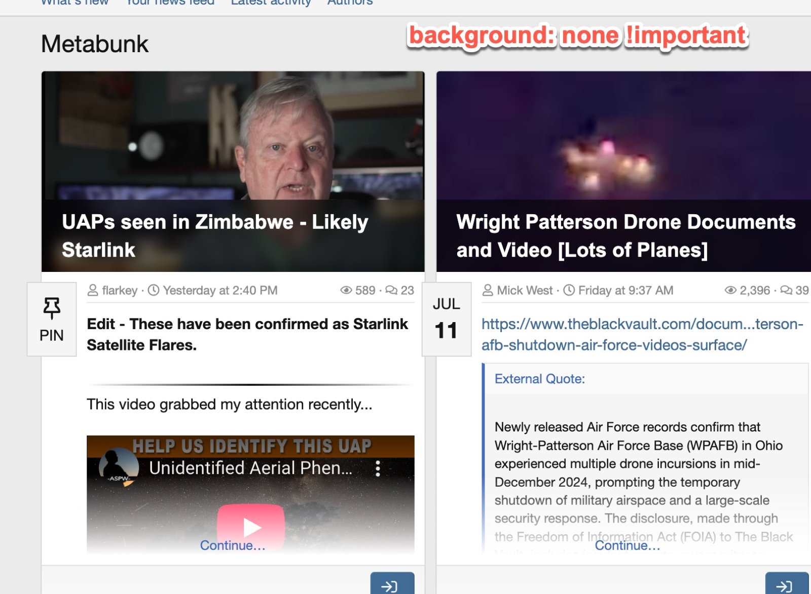 the selection on the Home page is an affront to all that is Holy and good ;) UFOs and left wing politics. and 90% boring-as-hell UFOs and Left wing politics. These are the best threads Metabunk has had since Jan 6th? Two posts,, including the January 6th one, are just advertisements for Reddit.