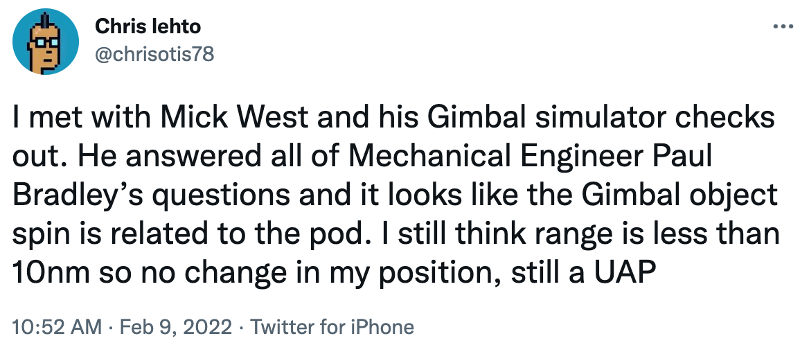 He had a whole presentation on the gimbal video, and the rotating glare hypothesis not working because the glare did not rotate enough. He says he got tired of the attention and deleted his twitter account. I'm not sure what he published and what he just shared with Chris.