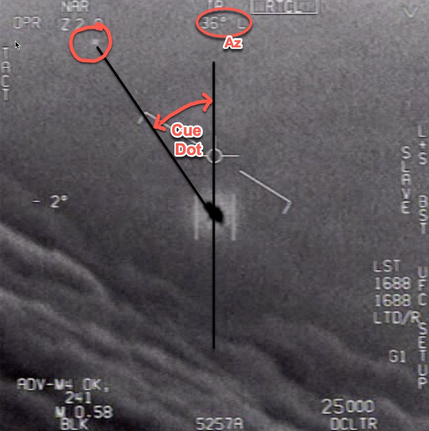 @Mick West , I got that, I'm talking about the vertical displacement of the cue dot. The moment when the blue circle and white circle interesect (wing plane, elevation plane). This is the moment when the cue should indicate 0 vertical offset. Because its upper bound is 0, it just moves horizontally at the top of the ATFLIR display after that. I was simply noting it's closer to the video with high A0A, but it's definitely very close given uncertainties on elevation especially.
