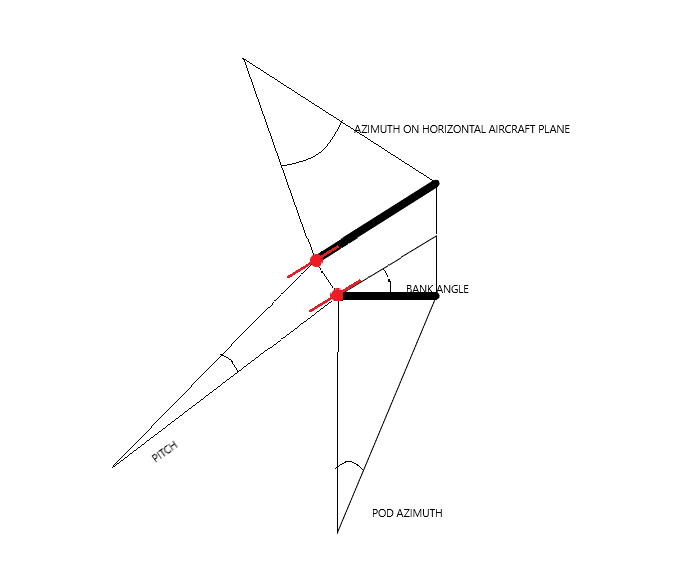 In the specific case that I have analyzed in gimbal, that is with pod azimuth -4°, bank angle 30° and a possible pitch angle of 5°, the corresponding angle on the horizontal plane of the aircraft should be even greater, i.e. about 7.5°. This simple diagram illustrates the geometric representation. The aircraft pointing towards the drawing is depicted in red. The angles are obviously exploded to be able to represent them in 2D.