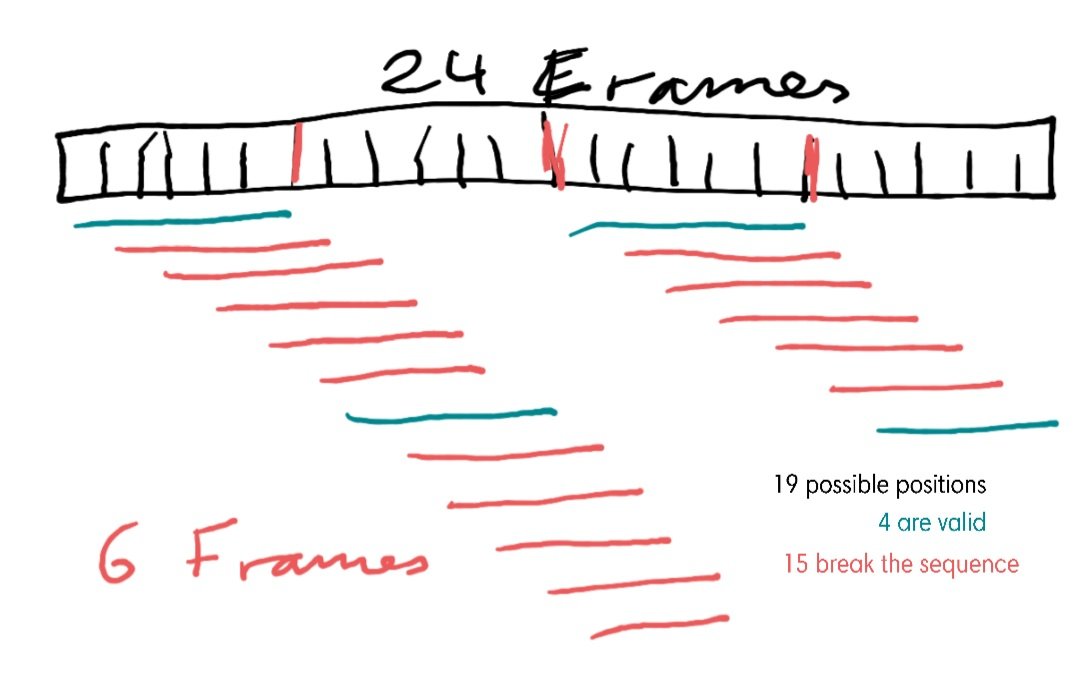 There thus are only 6 positions that any sequence of 6 could start on any snippet....and we have 4 snippets. We thus have 4 goes at getting it right. It is the fact that the relative positions on each snippet are the same that makes this so. You guys are thinking 1 to 24....but there really IS only 1 to 6 once the film is cut up.