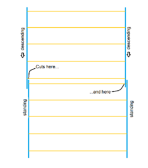 My diagram has one, and only one purpose: To visualize how floors would be chopped off the columns either by the descending wall (acting as a blade) passing inside the standing wall, or by the standing wall while the descending wall passes outside.