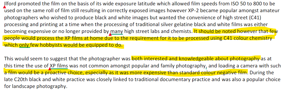 I also disagree that the choice of this film implies a 'knowledge or interest in photography'. Rarher the opposite. The main advantage of the Ilford XP chromogenic films was that they could be developed via C-41 process meaning it could be given to any supermarket or drugstore-chain which developed color film in automated labs. True B&W films require processing with B&W chemistry which was not performed by every chain store and if it was significantly more expensive because of the non-standard treatment compared with the masses of color negative film.