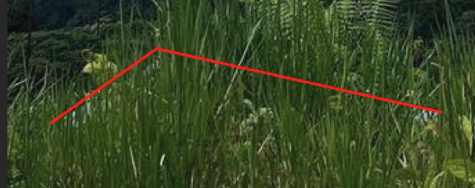 I think perhaps you're connecting dots that are not definite enough to put much confidence in. Looking at the photo, that left edge is definitely not a straight line. It looks more like a small gnarled dead branch lying in the grass. It has a portion at the end that bends straight upward, and a side twig that comes off toward the lower right.My feeling is the white parts are from a structure down the ridge behind the grass somewhat the leftmost "edge" seems straight and defined.