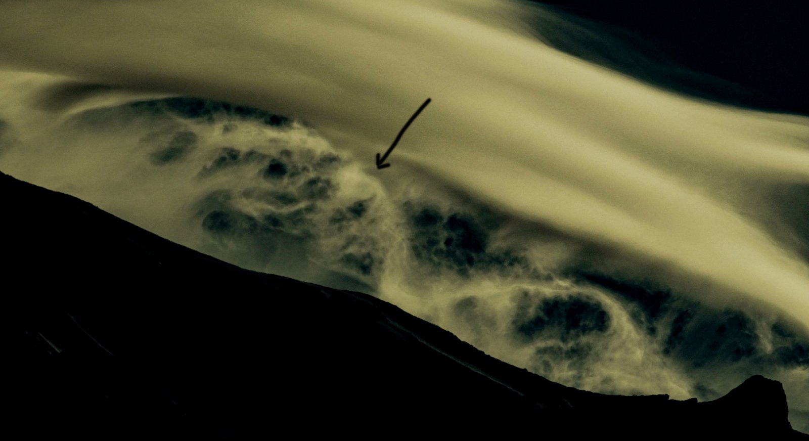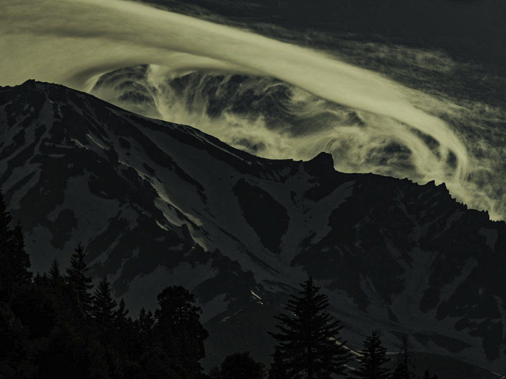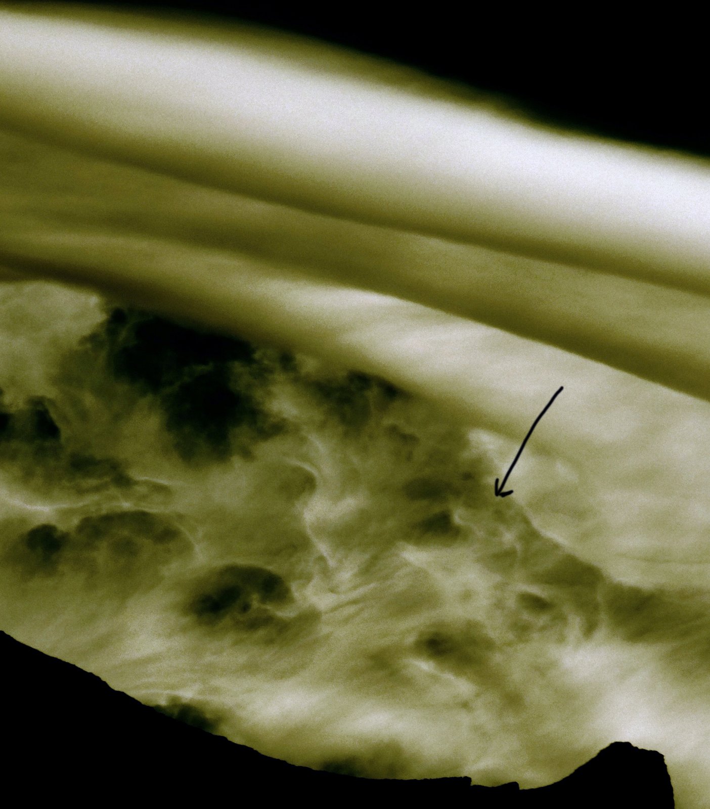 Your third observation is of an evolution of a cloud pattern above the mountain ridge, documented by a series of photos taken over two hour time. Your narrative implies this pattern is highly unusual and probably resulted from an impact of the object with the mountain. I do not quite understand why you keep suggesting to compare it with that was seen under a lenticular cloud, as you showed no evidence of such a cloud being over the mountain at the time of filming. I found