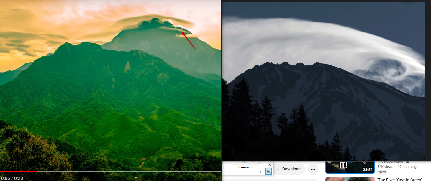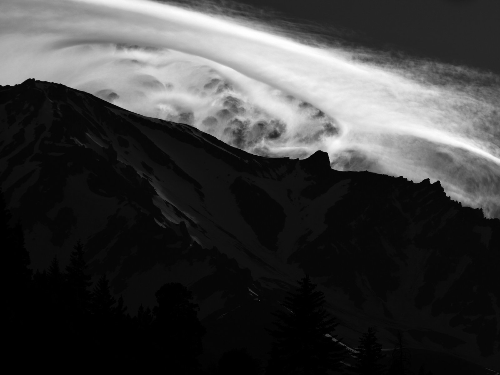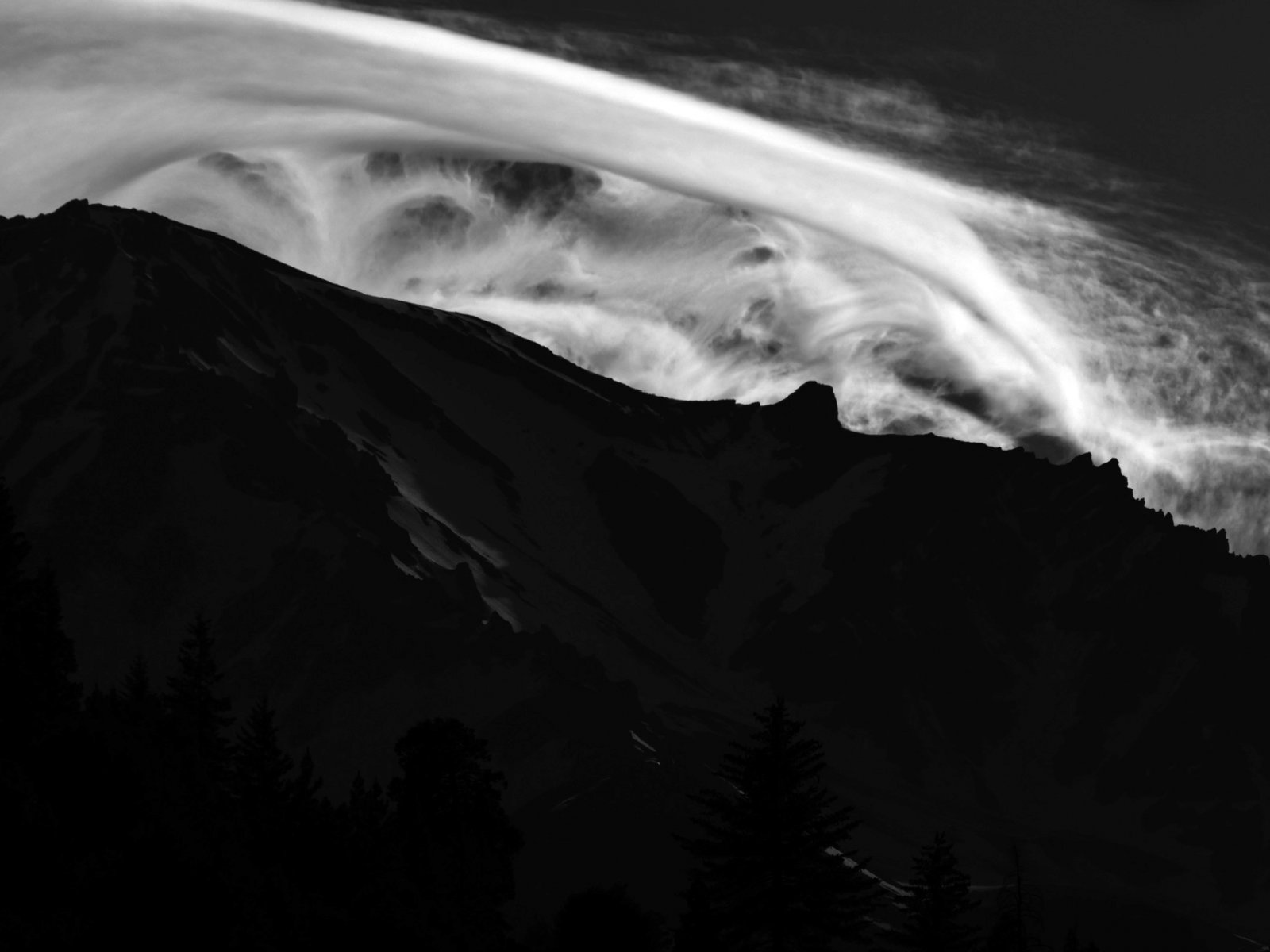 Your third observation is of an evolution of a cloud pattern above the mountain ridge, documented by a series of photos taken over two hour time. Your narrative implies this pattern is highly unusual and probably resulted from an impact of the object with the mountain. I do not quite understand why you keep suggesting to compare it with that was seen under a lenticular cloud, as you showed no evidence of such a cloud being over the mountain at the time of filming. I found