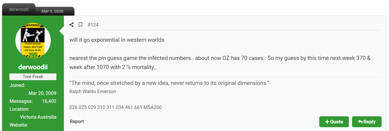 I had a guess last week at the infected number trajectory down in OZ,, its tracking pretty close to my assumptions was 70 souls by 9th March & its 350 today.. i really do hope im wrong with my the next 7 days rise..