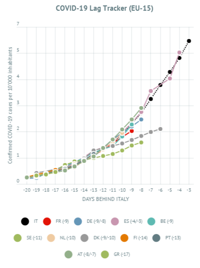 1. I compute the total number of cases per 1 million people population since the day when a sustained outbreak became visible - i.e. I exclude individual cases caused by people returning early from China that were immediately contained and did not spread. This goes on my x-axis