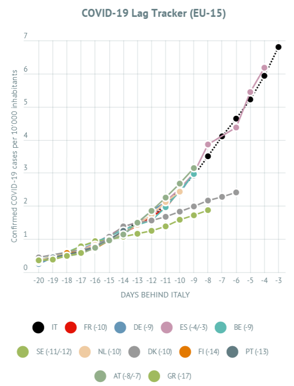 Sweden and Denmark are breaking away from Italy's trend. France and Germany may be starting to do the same. Spain is catching up with Italy.