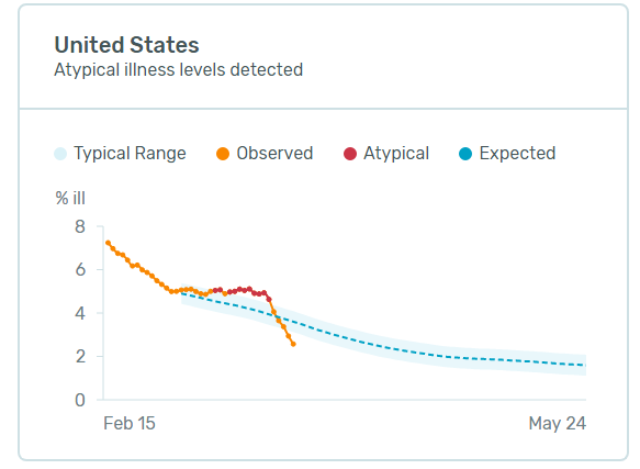 The US Health Weather Map is "Powered by kinsa insights" and has this note: "Due to widespread social distancing, school closures, stay-at-home orders, etc. feverish illness levels are dropping in many regions. This does not mean that COVID-19 cases are declining. In fact, we expect to see reported cases continue to surge in the near term, but it may indicate these measures are starting to slow the spread."