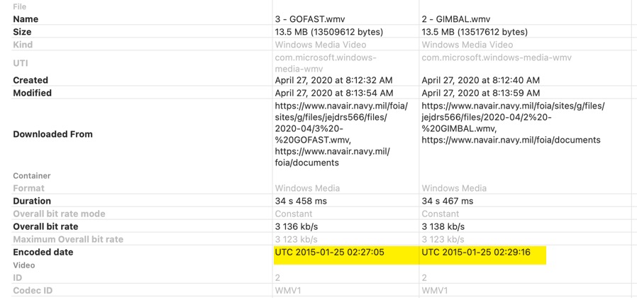 The Navy did not offer the exact designation numbers for the videos, but did reveal the dates for all three incidents. "[The] dates are 14 November 2004 for 'FLIR1' and 21 January 2015 for both 'Gimbal' and 'GoFast.'"