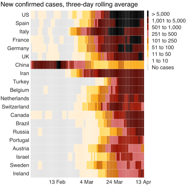 All that said about my enthusiasm for this chart, I would perhaps rather the levels were based on percentage of population rather than number of cases: I guess there's a big difference between 5,000+ cases in the US and 5,000+ cases in Belgium.