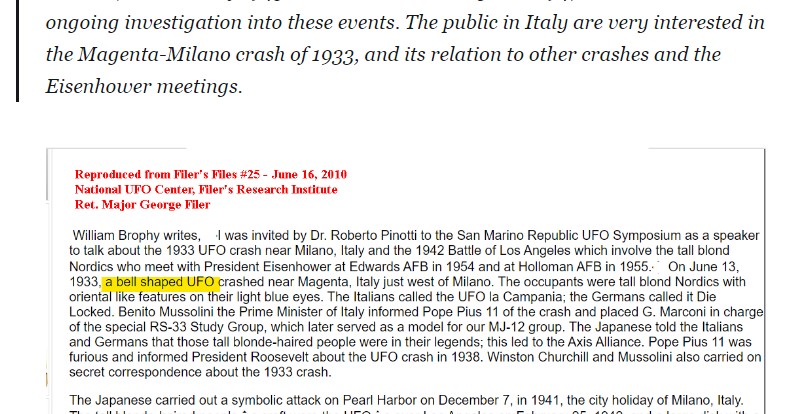 Not sure I get the overall point you're trying to make? That Grusch learned about the alleged Italian UFO crash through official channels because he identitied it as bell shaped? That "fact" is printed in the 2010 "Filer File" excerpt you posted above. That alone means Grusch (and anyone else) could have read of the purported bell shape from well known ufologist Major George Filer's "Research Institute" at least 13 years ago. Or am I missing what you're driving at?