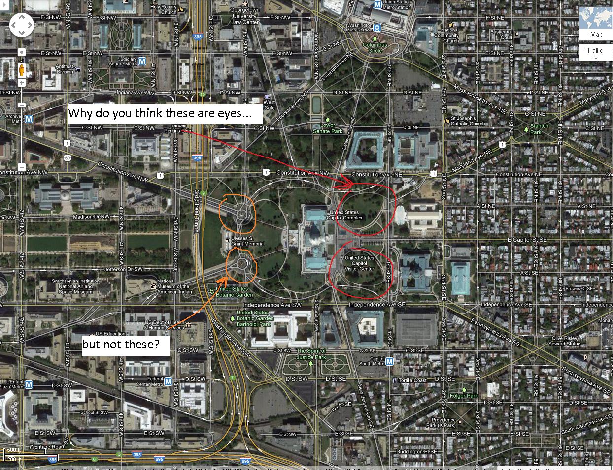 JVNK, as to your picture, the red-circled ovals are large, centrally-positioned, proportionately spaced with their wide bottoms tilted toward one another, and their narrow tops tilted away from one another. This is highly suggestive of a pair of eyes from a design perspective. The smaller circles at the base, which form simple crescent-grooves at the bottom of the image in the original design, are small, perfectly round, and closely spaced, while being entirely non-central from the image. If the large ovals are taken as eyes, which is obviously the way most minds tend to naturally view them from a design perspective, then you know which way is up and which way is down with the image. Above and on either side of the eyes the paths are clearly 'horned', as in they frame the narrow tops of the ovals with outward-jutting, triangular-shaped paths. The outlining path runs narrowly down past the oval 'eyes', but then bulges outward into a plumper, more circular shape toward the bottom. This shape, when viewed by most people in relation to the ovals, is clearly indicative of a setting for those 'eyes'. Now, viewing this setting as a 'face' comes pretty naturally, especially given that, in my tracing, the outline of the capitol building looks something like a 'mouth'. However, the 'face' it comes to resemble is inevitably an exceedingly silly one, to the point that comic-book kung-fu aardvarks and goofy tiki-masks are the only sorts of 'faces' it can be said to vaguely resemble. The shape of the outline is simply too wide in the 'cheeks', too rounded at the 'chin', and the crescent grooves don't indicate anything face-like. However, if the distinctly shaped outline is seen as resembling an owl, the wide, rounded outline, the 'horned' corners, and the crescent 'grooves' all fit rather perfectly, and match rather splendidly many classic 'owl' designs. That it also happens to fit the outline of comical caricatures of owls only reinforces this.