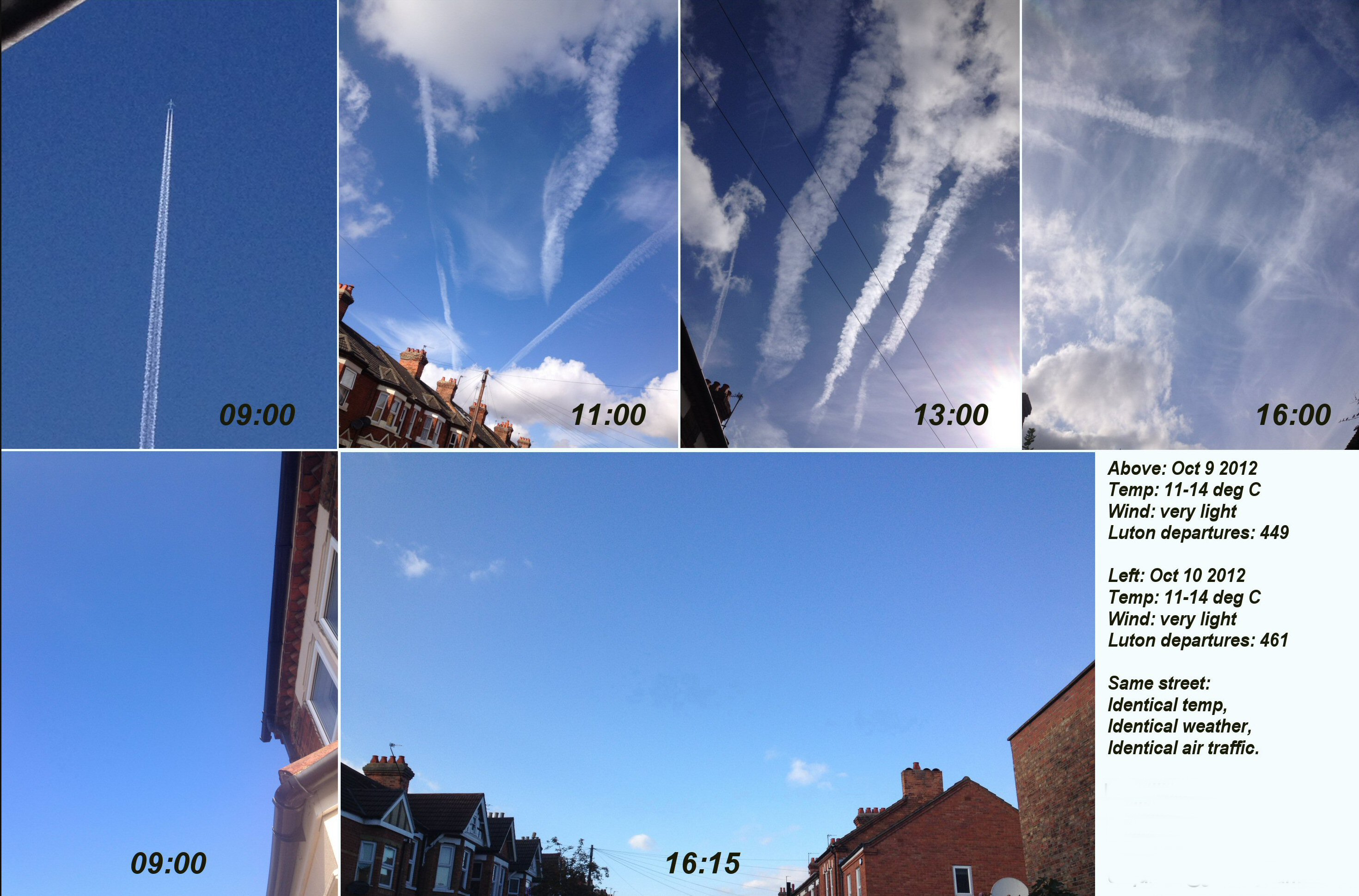 If you'd like to check weather balloon data, you can explain to me why, on the hottest day of the year (up to that date) August 16th 2012, the following mess was observed at around 1:00 pm, the hottest part of the day itself, directly over London; over Covent Garden in fact. Now, I lived in London from Oct 1978 until Dec 1992 and I never once saw anything like this, winter, summer, autumn spring. If even a single plane had left marks like this, people would have been very alarmed.