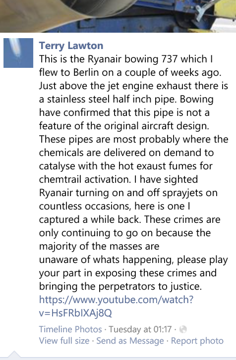 lol.. What's he talking about? Attacked by whom? Is he referring to people posting critical questions that keep him busy deleting anything that compromises his chem-pipes-theory?Ian Simpson is going to be a very busy. He was claiming the other day that he wants to take Facebook to court. Now it is every British Airline!