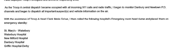 And in a similar previous shooting, the helicopters were not used, even though they were closer and standing by, and even though there were people who were critically injured, and even though there was a clear landing site right outside the doors of the Hartford Distributors, it was simply quicker to use the ambulance. Just like at Sandy Hook.
