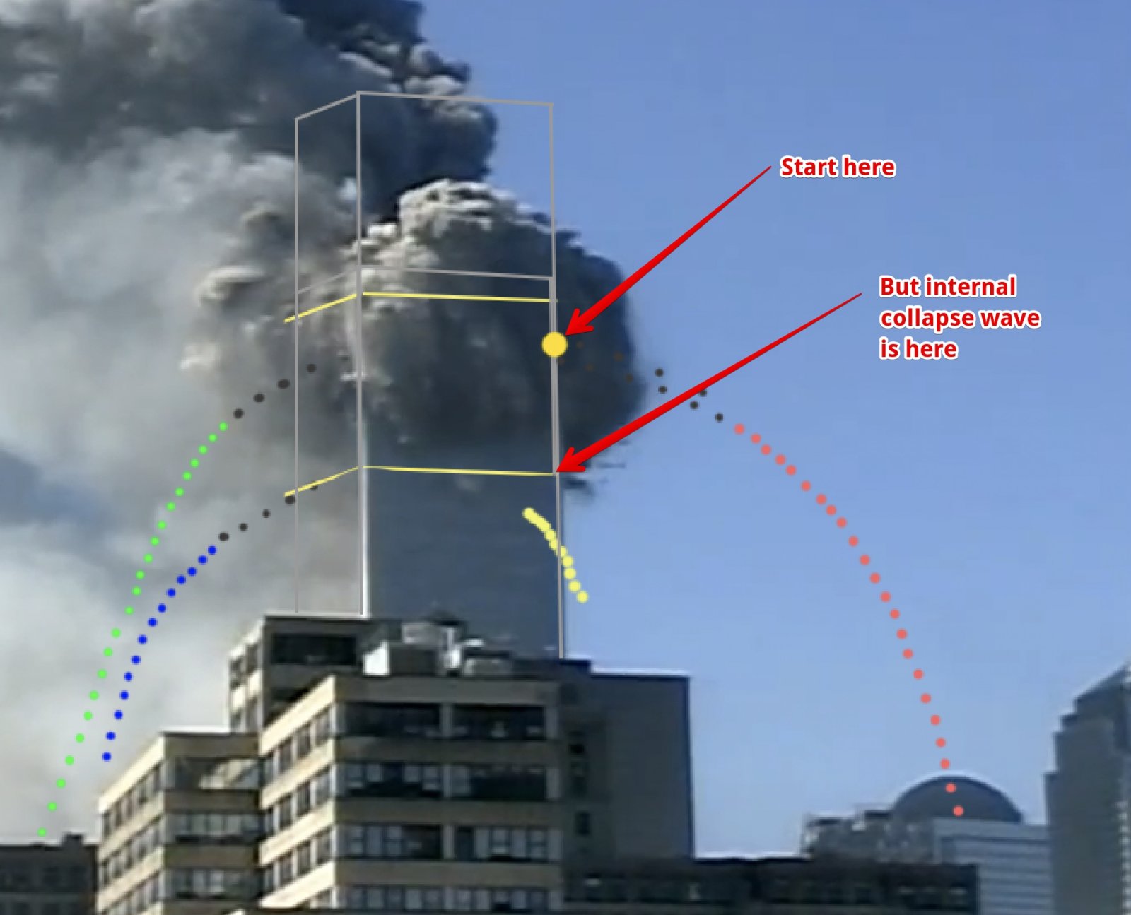 I've come to the same conclusion, that is the pieces are clearly peeling away from the towers, rather than being ejected out. Given the enormous height of the towers, it should be expected that pieces end up hundreds of feet away as the sides fall away.