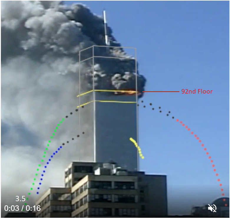 1:59 "On a video of the south tower, I noticed a large elongated object moving like a javelin above the main debris cloud. On the original video where I saw this object, the camera was zooming the whole time which made the measurement difficult."