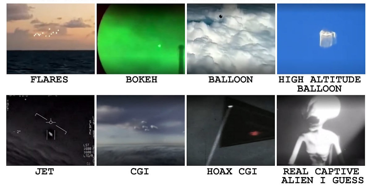 Shamelessly stolen and cropped from @Charlie Wiser at https://threedollarkit.weebly.com/blog/the-journalist-the-scientist-and-the-bodyguard . Apparently, these images (not the captions!) ran on an actual news segment about UFOs.