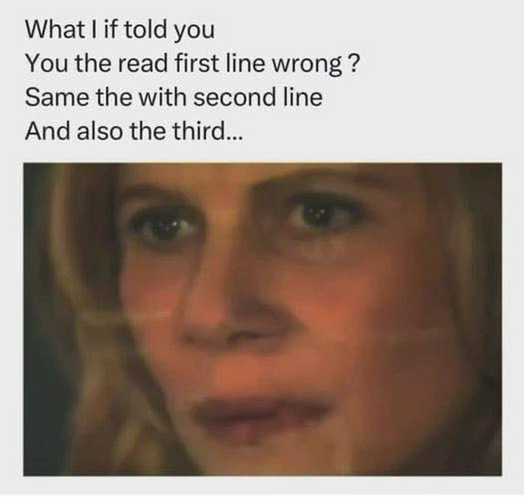 That's incredibly well put!Damn! That got me, I had to read a few more times before seeing it. My mind just filled in what it thought the lines said.