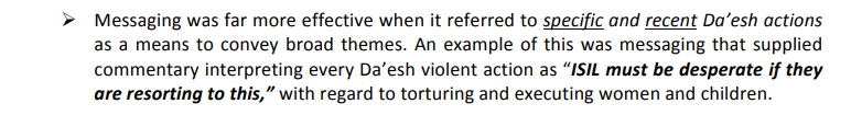 This is a white paper covering a Counter-Daesh Influence Operations simulation that has some beneficial points. As an example, when we use the term "truth" or "real", the "believer" audiences already have a belief in what is "true" or "real". If we decide to use these terms in support of our point, it will degrade our point with the audience.