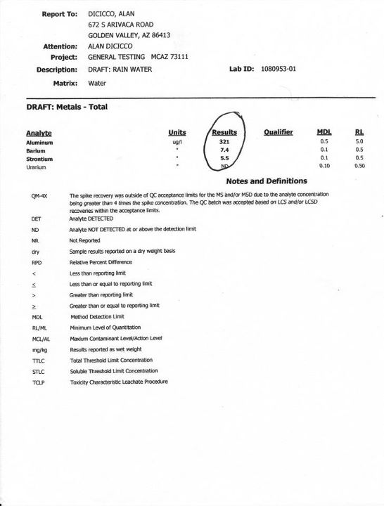 Rainwater "highlight" from Redding, CA: Strontium: 820 ug/l. From our consulted retired USDA scientist: "Having strontium in the rain is....artificial absolutely".*