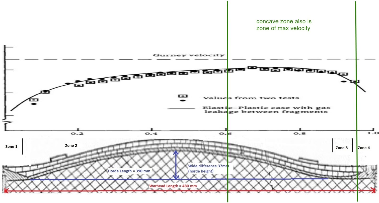 Surface have gibbous as arc of inner ring with R=532 mm. Pellets flying by perpendicular to surface + Taylor angle. So gibbous sent equally to forward and back pellets from middile part (with Taylor angle rotate from detonator end - to backward for 9N314). Pellets from Zone1 and Zone4 cannot have enough big angles and speed (must pass structures of warhead's ends and missile), Pellets from Zone 3 flying on disclosure angles for cylinder warhead with correction on higher energy from Zone 2 + taylor angle.