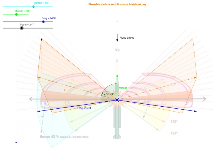 The dynamic velocity fragment distribution results from Mick's tool suggest that the fragments closest to the 90 deg angle have the lowest relative velocity. With missile speed 1000 m/s and fragment speed 2000 m/s, velocity of these 'back-firing' fragments that would end up in Almaz Antey's "lancet" will have about 14% reduced relative speed, which (with Ek=mv^2) implies about 26% less kinetic energy in these fragments than the average in the blast cone.