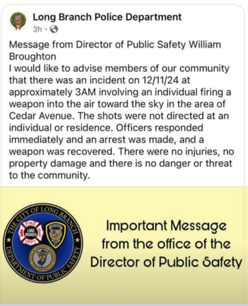 Someone fired into the sky last night in Long Branch, which is on the Jersey coast, right in the drone hysteria zone. Connect the dots...